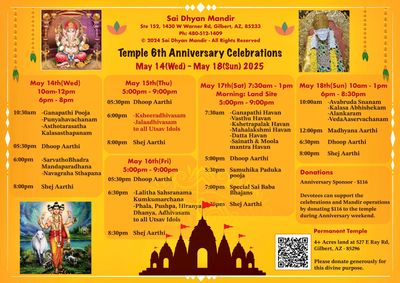 As part of our Sixth Anniversary Celebrations, the below rituals scheduled at Mandir during coming week, all devotees are welcome to participate.