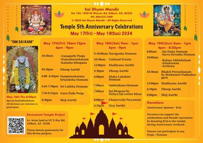 With Baba’s grace and our Guruji’s blessings, Sai Dhyan Mandir invites all devotees to participate in Sri Maha Rudra Yagam happening from March 6th to March 10th at newly purchased land 527 E Ray Rd, Gilbert,AZ 85233.