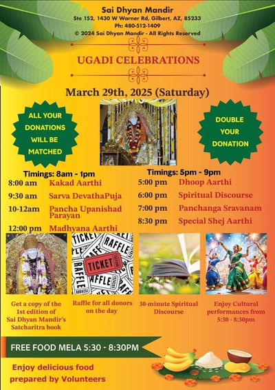 Happy Ugadhi New year, Sai Dhyan Mandir wishes peace and prosperity to all our devotee families. Baba Blessings with you all the time.