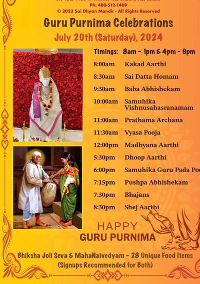 Sai Dhyan Mandir is celebrating Gurupurnima on 4th July. Please see the below schedule for details.