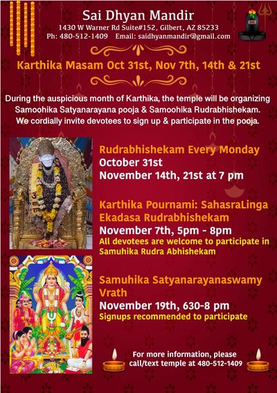 Attached is our Karthika Masam schedule. All are welcome to participate in Abhishekam Every Monday including Karthika Pournami.